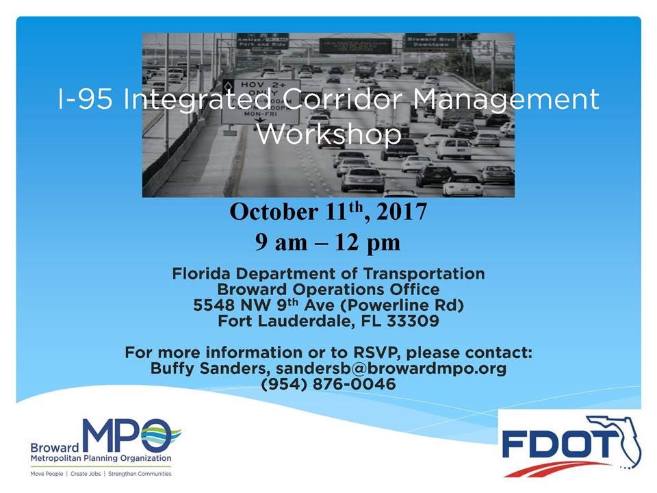 The Broward Metropolitan Planning Organization (MPO), Department of Transportation (FDOT), and its partners are looking to use an Integrated Corridor Management (ICM) approach to manage the I-95 corridor as a multimodal system and make operational decisions for the benefit of the corridor as a whole.