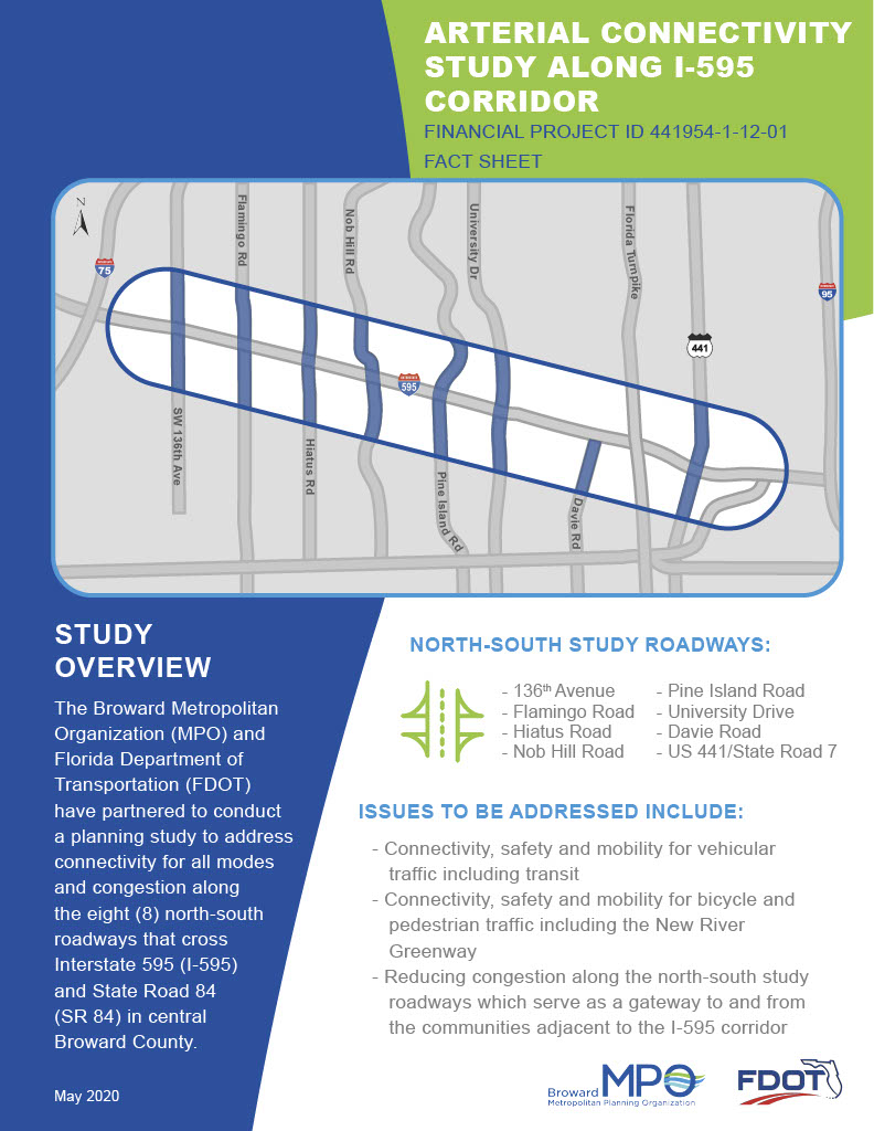 The Broward Metropolitan Organization (MPO) and Florida Department of Transportation (FDOT) have partnered to conduct a planning study to address connectivity for all modes and congestion along the eight (8) north-south roadways that cross Interstate 595 (I-595) and State Road 84 (SR 84) in central Broward County.