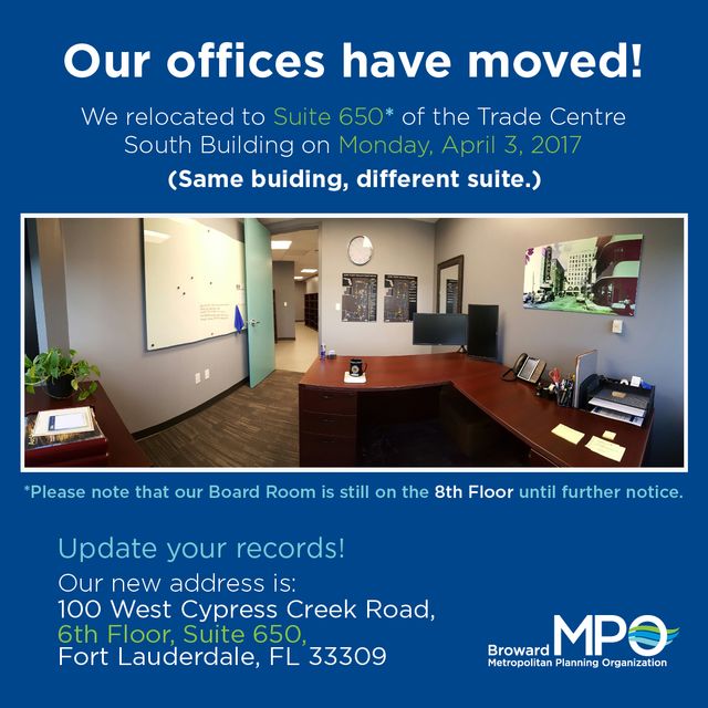 Please be advised that the #BrowardMPO Office has moved offices! We've got a new office and new suite number.