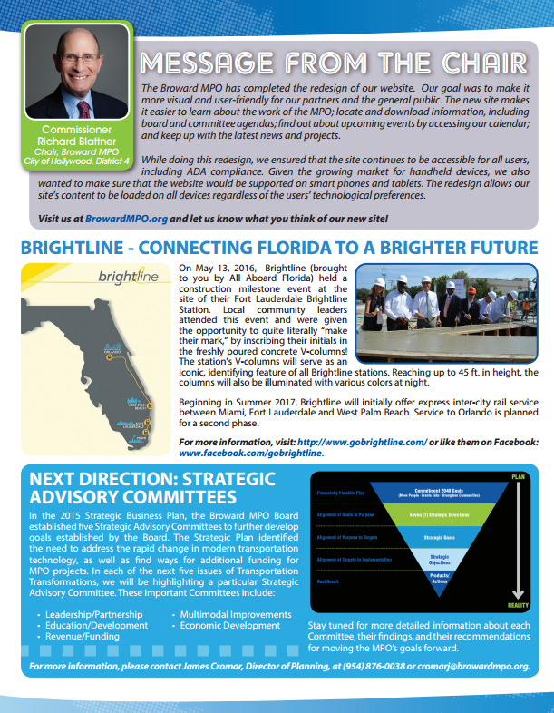The Broward MPO's Summer 2016 newsletter is now available- in both English and Creole! Click on the jump to read more about the MPO's TIGER Grant, updates on the Brightline train service, and more.